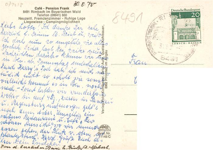 73887258 alte Postkarte Rimbach Bayrischer Wald Cafe Frank Terrasse Panorama postalisch gelaufen Erhaltung siehe scans [FriedD77] KatCode: 11110009372151