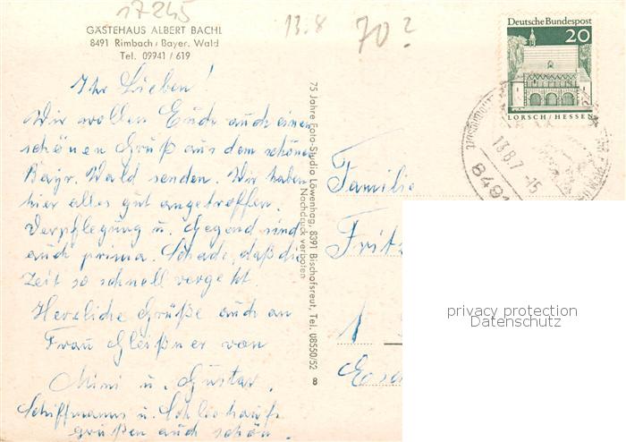 73796420 alte Postkarte Rimbach Bayrischer Wald Gaestehaus Albert Bach postalisch gelaufen Erhaltung siehe scans [WerneD78] KatCode: 11110009372151