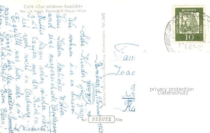 73762354 alte Postkarte Rimbach Bayrischer Wald Panorama Burgruine Lichtenegg Arberpartie Cafe Zur schoenen Aussicht Gaststube postalisch gelaufen Erhaltung siehe scans [FriedD77] KatCode: 11110009372151
