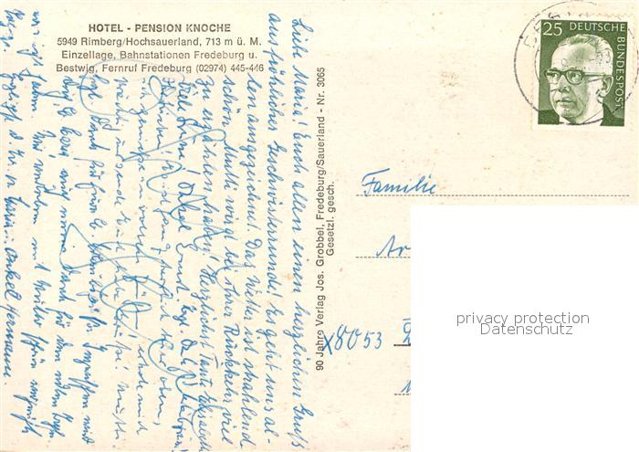 73171392 alte Postkarte Rimberg Schmallenberg Hotel Pension Knoche Ansicht vom Waldrand aus postalisch gelaufen Erhaltung siehe scans [FriedD77] KatCode: 11110005958040