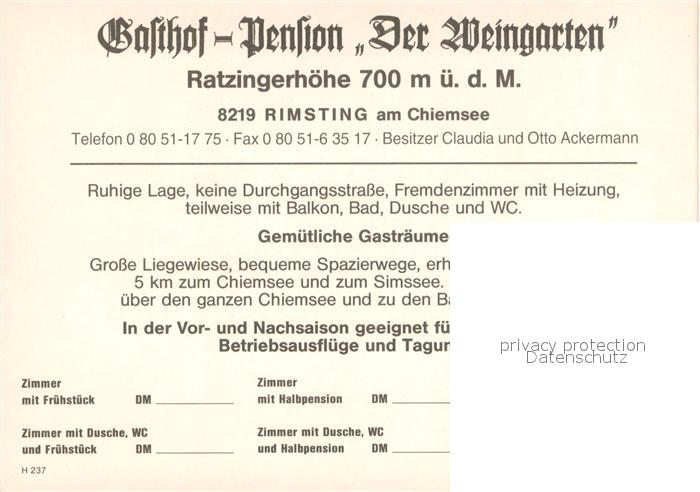 73641178 Rimsting Gasthof Pension Der Weingarten postalisch nicht gelaufen Werbekarte (keine Postkarte) Erhaltung siehe scans [WerneD78] KatCode: 11110009187168