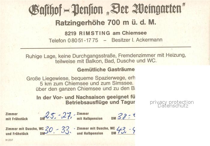 73574837 Rimsting Gasthof Pension Der Weingarten Terrasse postalisch nicht gelaufen Werbekarte (keine Postkarte) Erhaltung siehe scans [FriedD77] KatCode: 11110009187168