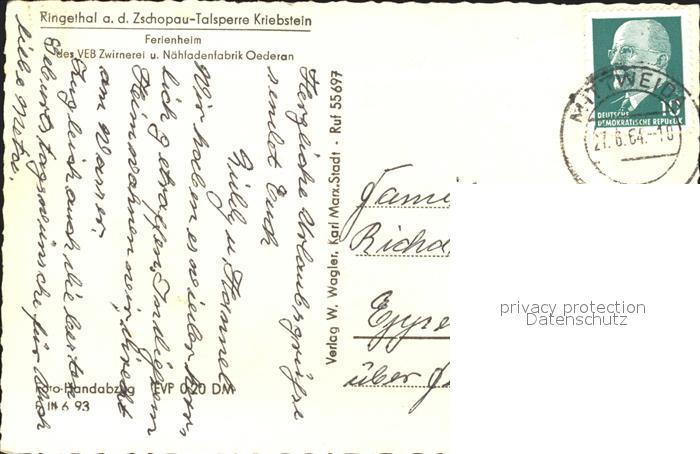 72180874 alte Postkarte Ringethal Mittweida Ferienheim des VEB Oederan postalisch gelaufen Erhaltung siehe scans KatCode: 11110014182280