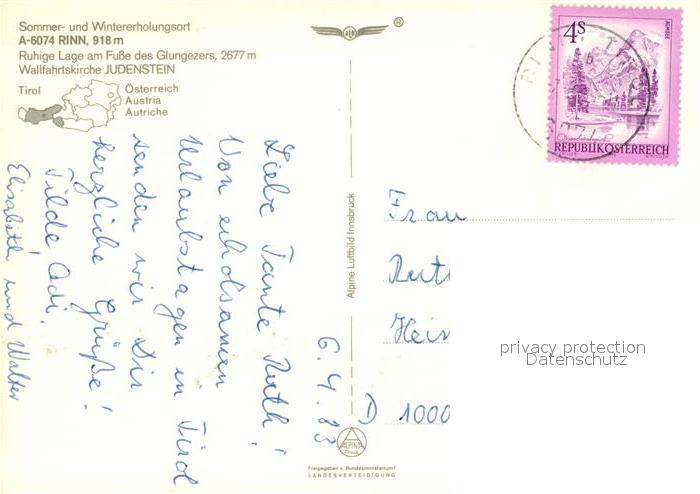 73185195 alte Postkarte Rinn Fliegeraufnahme Wallfahrtskirche Judenstein postalisch gelaufen Erhaltung siehe scans [LiesaD40] KatCode: 11390332070345