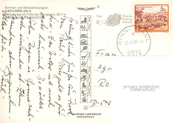 72943852 alte Postkarte Rinn Fliegeraufnahme postalisch gelaufen Erhaltung siehe scans [KathaD81] KatCode: 11390332070345