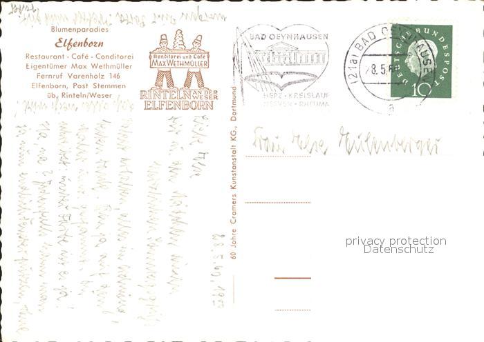 72002977 alte Postkarte Rinteln Weser Niedersachsen Blumenparadies Elfenborn Restaurant Cafe Conditorei postalisch gelaufen Erhaltung siehe scans KatCode: 11110003257031