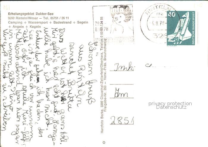 71928857 alte Postkarte Rinteln Weser Niedersachsen Fliegeraufnahme Doktor See Camping Wassersport Baestran Segeln Angeln postalisch gelaufen Erhaltung siehe scans KatCode: 11110003257031