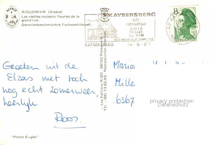 12687364 carte postale Riquewihr Haut Rhin Vieilles maisons fleuries Fachwerkhaeuser postalisch gelaufen Erhaltung siehe scans [FriedD77] KatCode: 11170068568277