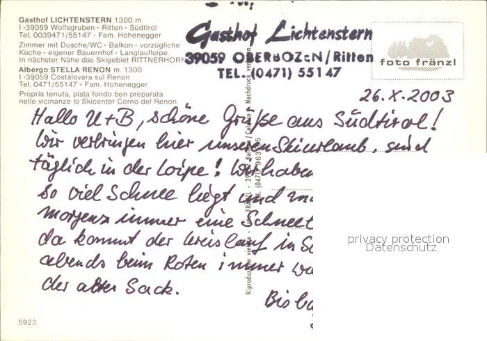 Ritten Renon Gasthof Lichtenstein Skilaeufer postalisch nicht gelaufen Erhaltung siehe scans