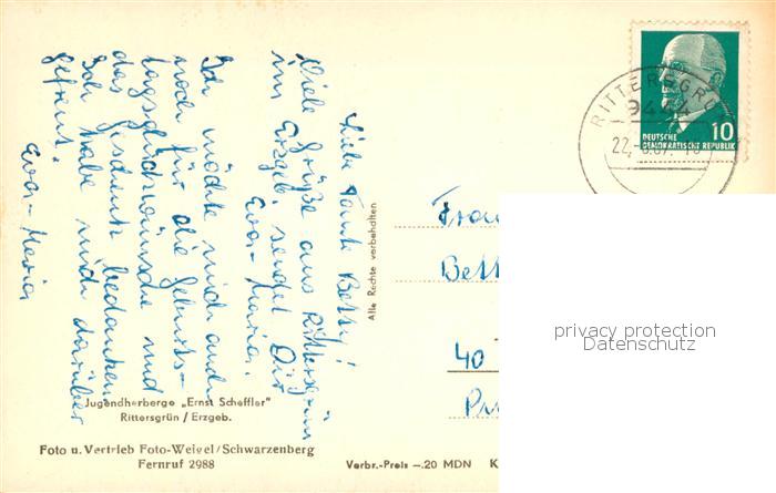 73764627 alte Postkarte Rittersgruen Jugendherberge Ernst Scheffler postalisch gelaufen Erhaltung siehe scans [WerneD78] KatCode: 11110014191260