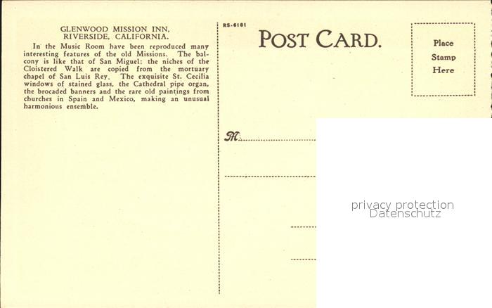 72432380 Riverside California Cloister Music Room Mission Inn postalisch nicht gelaufen Erhaltung siehe scans KatCode: 14140050000000