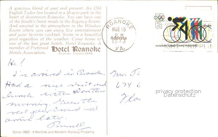 71919104 old postcard Roanoke Virginia Hotel Roanoke postalisch gelaufen Erhaltung siehe scans KatCode: 14140490000000