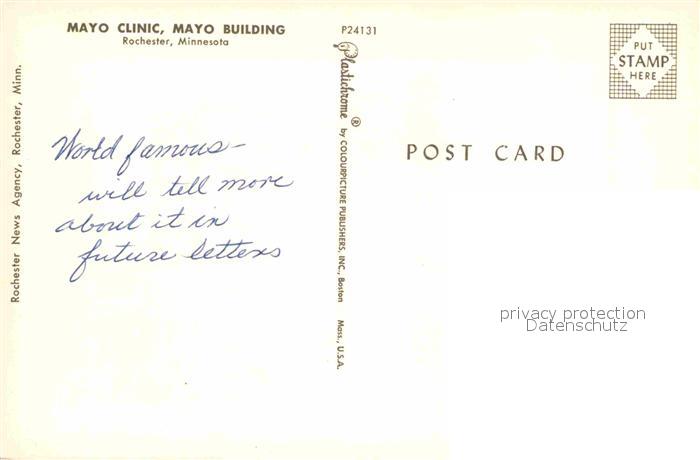 72763596 Rochester Minnesota Mayo-Clinic Mayo-Building postalisch nicht gelaufen Erhaltung siehe scans [LiesaD40] KatCode: 14140250000000