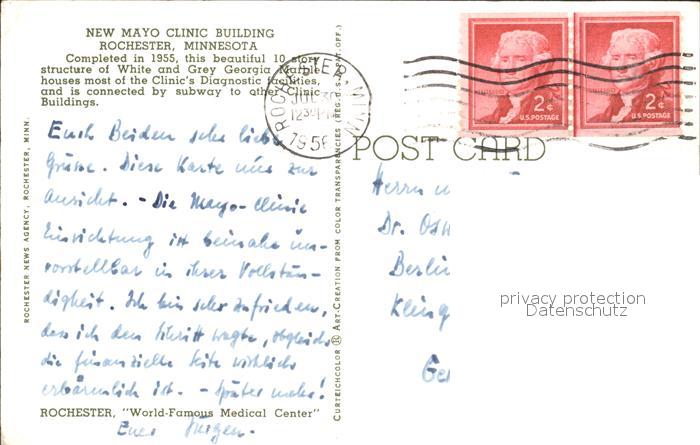 72249388 old postcard Rochester Minnesota New Mayo Clinic Building postalisch gelaufen Erhaltung siehe scans KatCode: 14140250000000