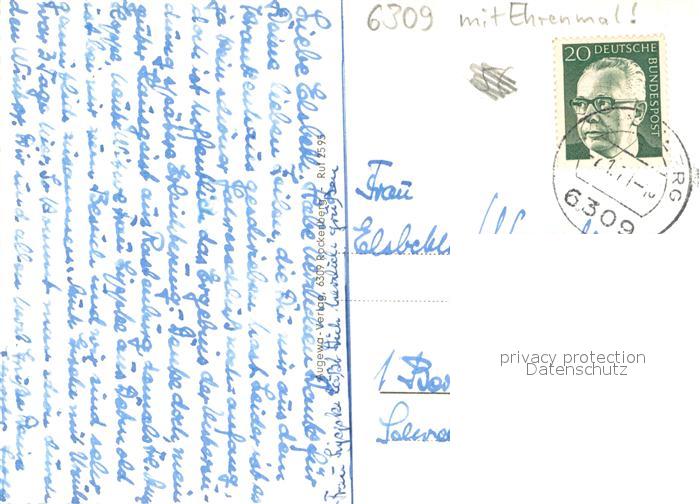 73693909 alte Postkarte Rockenberg Gesamtansicht Muenzenburg Partie an der Wetter Ehrenmal postalisch gelaufen Erhaltung siehe scans [FriedD77] KatCode: 11110006440022