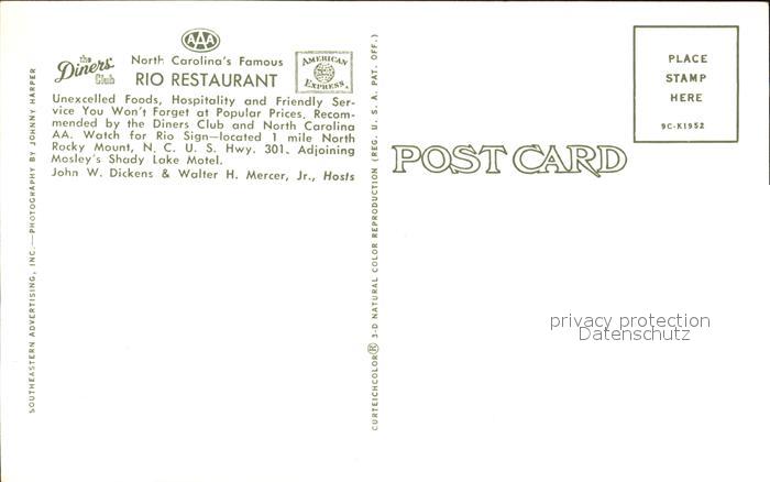 72490694 Rocky Mount North Carolina Rio Restaurant Diners Club postalisch nicht gelaufen Erhaltung siehe scans KatCode: 14140350000000