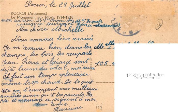 13489523 carte postale Rocroi Le Monument aux Morts 1914 bis 18 postalisch gelaufen Erhaltung siehe scans [WerneD78] KatCode: 11170008108367