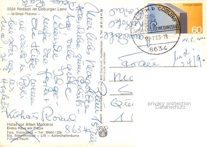 72853070 alte Postkarte Rodach Coburg Thermalbad postalisch gelaufen Erhaltung siehe scans [NatalD47] KatCode: 11110009473158