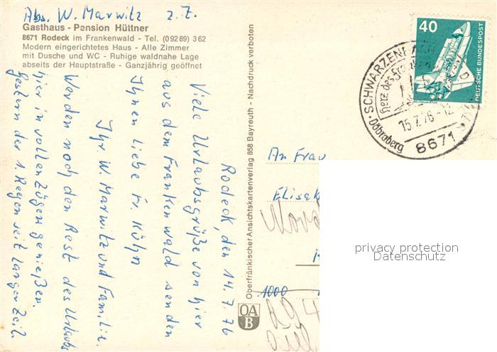 73731348 alte Postkarte Rodeck Gasthaus Pension Huettner Gastraum Landschaftspanorama Frankenwald postalisch gelaufen Erhaltung siehe scans [FriedD77] KatCode: 11110009475169