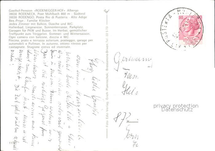 old postcard Rodeneck Italien Gasthof Pension Rodenegger Hof Gastraum Burg Panorama postalisch gelaufen Erhaltung siehe scans
