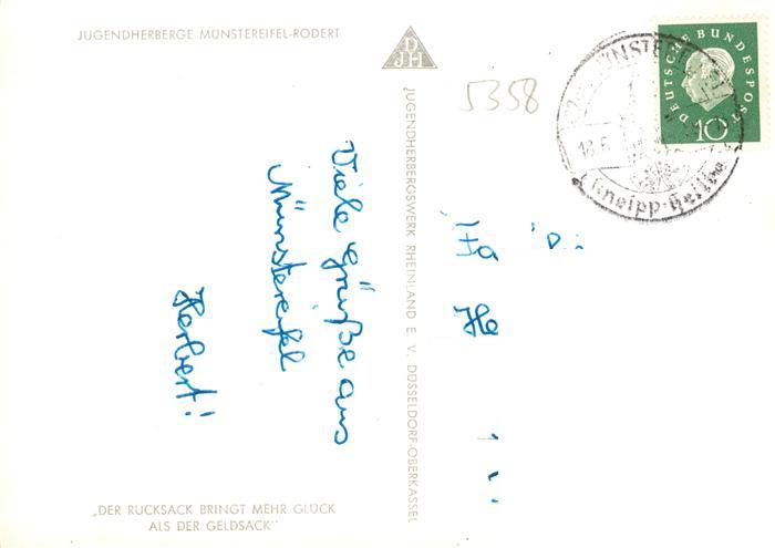 73890543 alte Postkarte Rodert Jugendherberge Muenstereifel Rodert postalisch gelaufen Erhaltung siehe scans [FriedD77] KatCode: 11110005366004