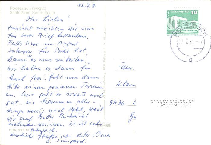 72299017 alte Postkarte Rodewisch Schloss Gondelteich postalisch gelaufen Erhaltung siehe scans KatCode: 11110014178540