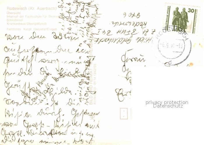 72650876 alte Postkarte Rodewisch uebersicht Internat Fachschule fuer oekonomie Schlossinsel Krankenhaus Obergoeltzsch postalisch gelaufen Erhaltung siehe scans [FriedD77] KatCode: 11110014178540