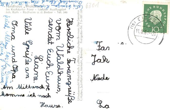 73899659 alte Postkarte Rodheim-Bieber Forsthaus Waldhaus postalisch gelaufen Erhaltung siehe scans [FriedD77] KatCode: 11110006531002