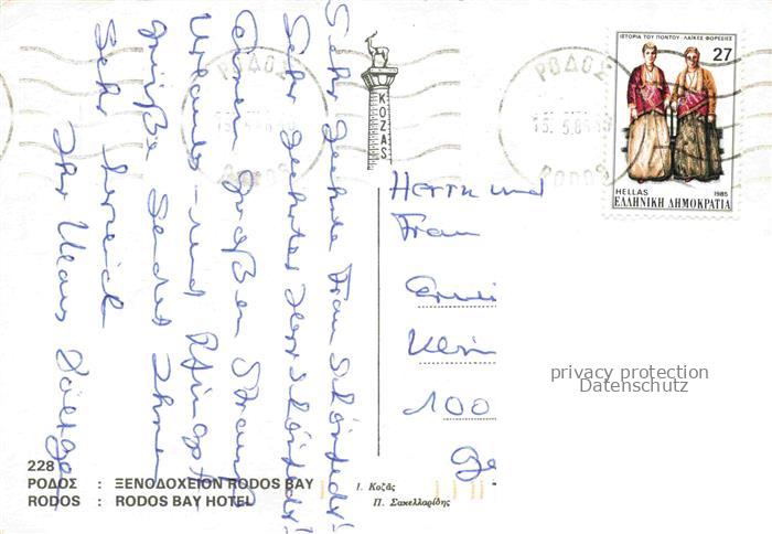 74156181 old postcard Rodos Rhodes Rhodos Greece Hotel Rodos Bay Strand Hafen Sonnenuntergang Ruinen postalisch gelaufen Erhaltung siehe scans [FriedD77] KatCode: 11190