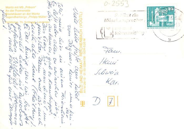 73948070 alte Postkarte Roebel Mueritz MS Priborn An der Promenade Bootshaeuser an der Mueritz Jugendherberge Philipp Mueller postalisch gelaufen Erhaltung siehe scans [WerneD78] KatCode: 11110013056057