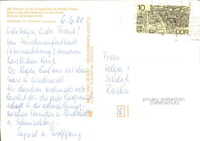 72406211 alte Postkarte Roebel Mueritz MS Priborn Dampfer Anlegestelle Weisse Flotte Bootshaeuser Schampermuehle postalisch gelaufen Erhaltung siehe scans KatCode: 11110013056057