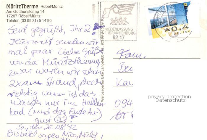 73648756 alte Postkarte Roebel Mueritz Mueriz Therme Whirlpool Thermalbecken Bowlingbahn postalisch gelaufen Erhaltung siehe scans [WerneD78] KatCode: 11110013056057