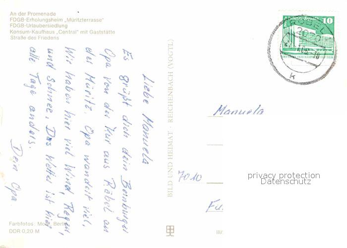 72654308 alte Postkarte Roebel Mueritz Promenade FDGB Erholungsheim Mueritzterrasse Urlaubersiedlung Konsum Kaufhaus Central Gaststaette Strasse des Friedens postalisch gelaufen Erhaltung siehe scans [WerneD78] KatCode: 11110013056057