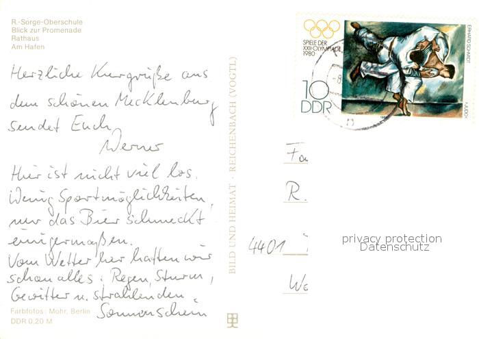 73649841 alte Postkarte Roebel Mueritz R.-Sorge-Oberschule Promenade Rathaus Hafen Mecklenburgische Seenplatte postalisch gelaufen Erhaltung siehe scans [FriedD77] KatCode: 11110013056057
