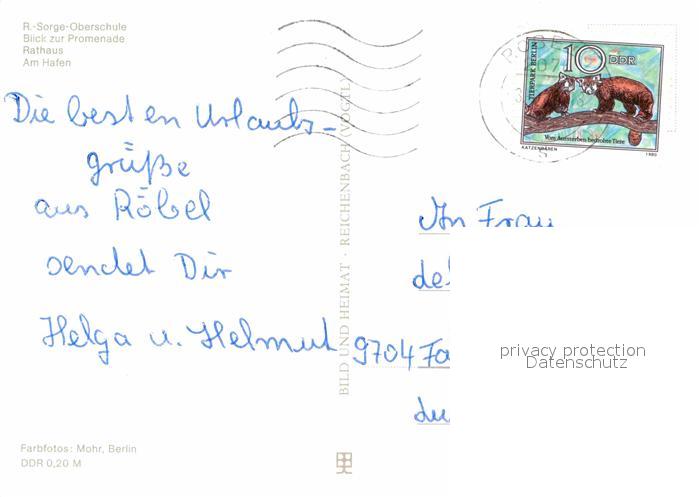 72654852 alte Postkarte Roebel Mueritz Sorge-Oberschule Rathaus Hafen postalisch gelaufen Erhaltung siehe scans [AndreD76] KatCode: 11110013056057
