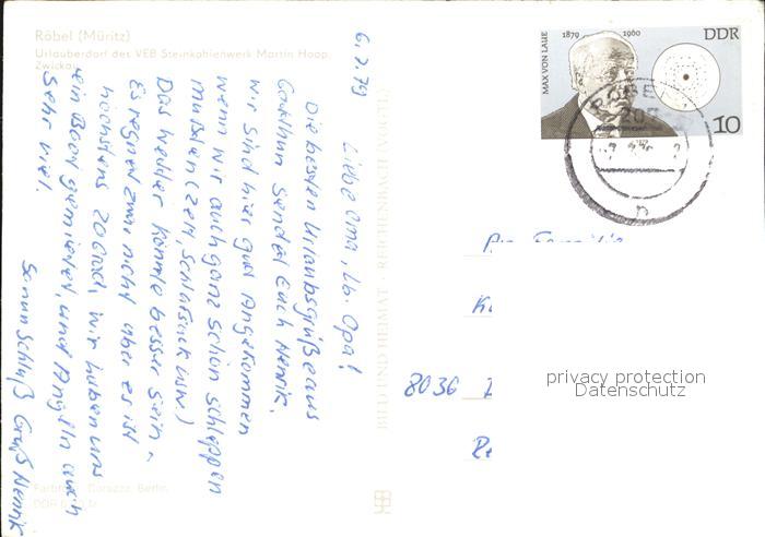 72586742 alte Postkarte Roebel Mueritz Urlauberdorf des VEB Steinkohlenwerk Martin Hoop Zwickau postalisch gelaufen Erhaltung siehe scans [WerneD78] KatCode: 11110013056057