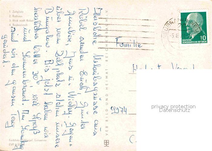 72773376 alte Postkarte Roebel Mueritz Zeltplatz Rathaus Segelhafen Badestrand postalisch gelaufen Erhaltung siehe scans [FriedD77] KatCode: 11110013056057