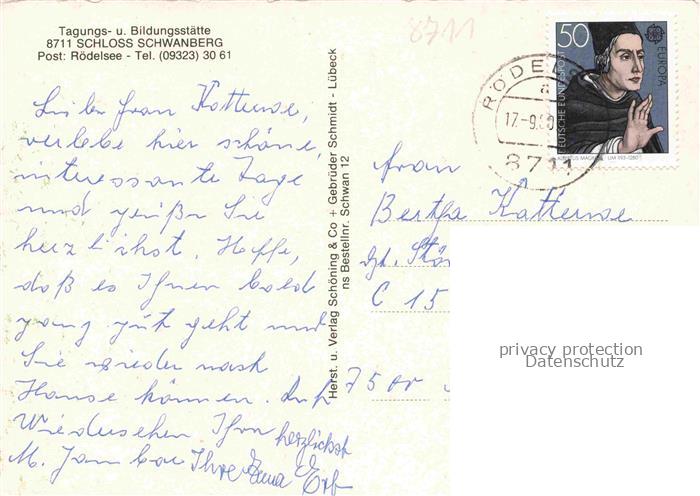 74054357 alte Postkarte Roedelsee Bayern Schloss Schwanberg postalisch gelaufen Erhaltung siehe scans [WerneD78] KatCode: 11110009675161
