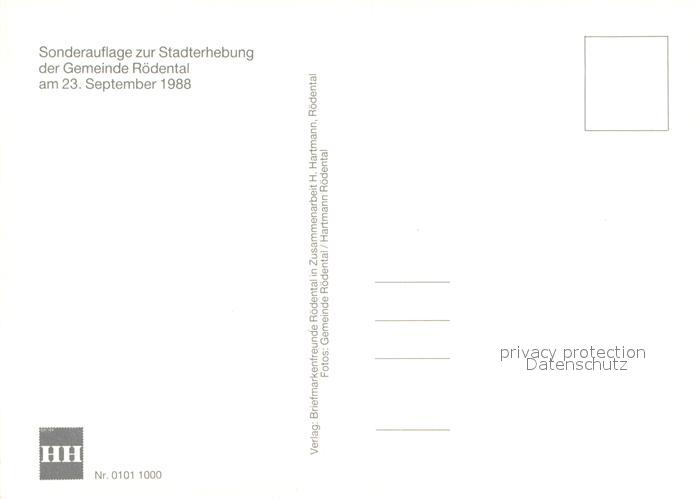 73671618 Roedental Kirche Einberg Landschaftspanorama Kulm mit Weinberg Kloster Moenchroeden Schloss Rosenau Sonderauflage zur Stadterhebung am 23. September 1988 postalisch nicht gelaufen Erhaltung siehe scans [FriedD77] KatCode: 11110009473159