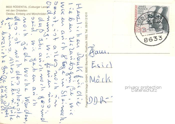 73671609 alte Postkarte Roedental mit den Ortsteilen Oeslau Einberg und Moenchroeden postalisch gelaufen Erhaltung siehe scans [FriedD77] KatCode: 11110009473159