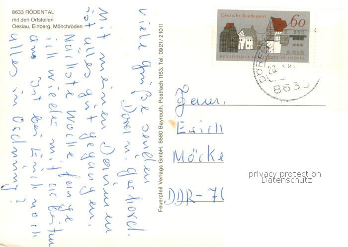 73671608 alte Postkarte Roedental mit den Ortsteilen Oeslau Einberg und Moenchroeden postalisch gelaufen Erhaltung siehe scans [FriedD77] KatCode: 11110009473159