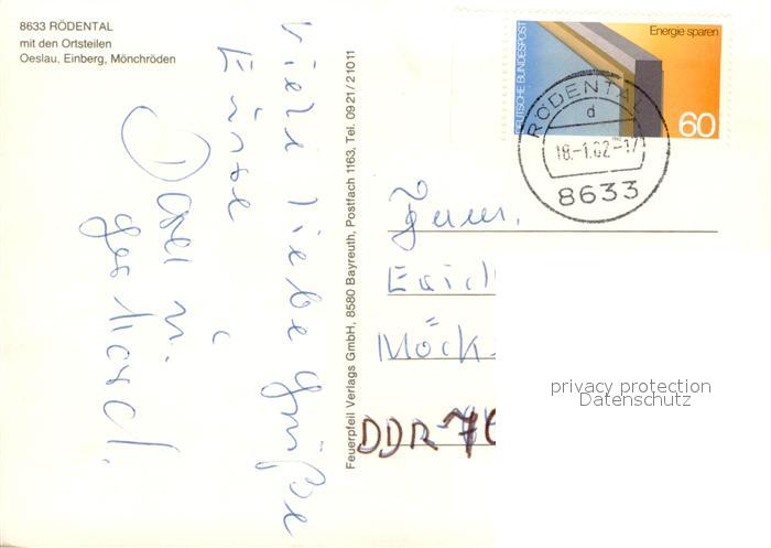 73671607 alte Postkarte Roedental mit den Ortsteilen Oeslau Einberg und Moenchroeden postalisch gelaufen Erhaltung siehe scans [FriedD77] KatCode: 11110009473159
