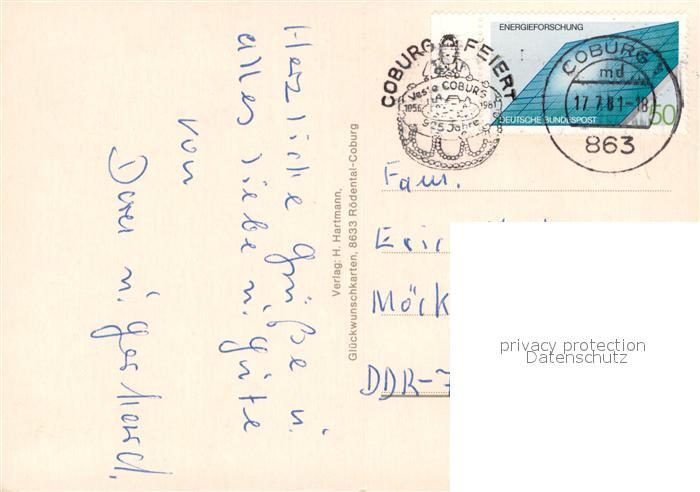 73671569 alte Postkarte Roedental Schloss Rosenau Happachsmuehle Kloster Moenchroeden Altenwohnheim Hallenbad Blick vom weissen Huegel postalisch gelaufen Erhaltung siehe scans [FriedD77] KatCode: 11110009473159
