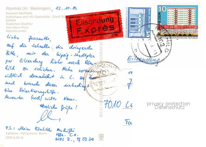 72628513 alte Postkarte Roemhild Konsum Kaufhalle Kulturhaus HOG Stadt Roemhild Schloss Suedl Stadttor Karl Marx Platz Marktbrunnen postalisch gelaufen Erhaltung siehe scans [WerneD78] KatCode: 11110016069038