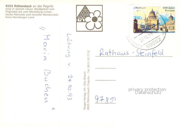 73874229 alte Postkarte Roethenbach Pegnitz Schloss Renzenhof Rathaus Aussichtsturm Moritzkapelle Schloesschen Schloss Haiendorf Jagdschloesschen Rockenbrunn postalisch gelaufen Erhaltung siehe scans [WerneD78] KatCode: 11110009574152