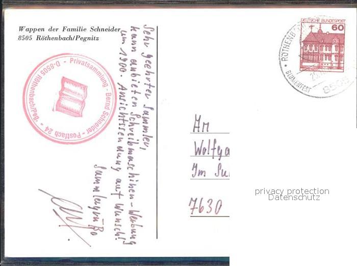 72143747 alte Postkarte Roethenbach Pegnitz Wappen der Familie Schneider postalisch gelaufen Erhaltung siehe scans KatCode: 11110009574152