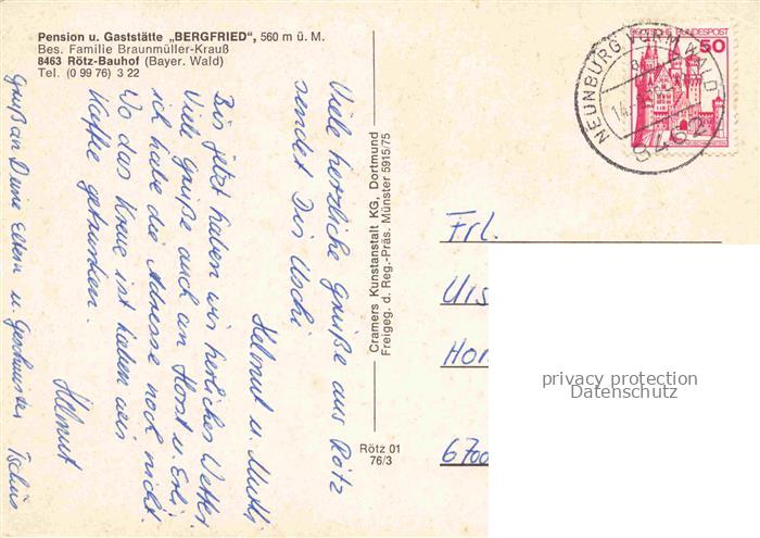74050464 alte Postkarte Roetz Oberpfalz Pension Gaststaette Bergfried postalisch gelaufen Werbekarte (keine Postkarte) Erhaltung siehe scans [WerneD78] KatCode: 11110009372154