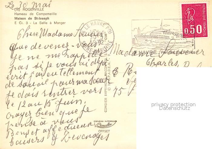 13586309 Rogerville Maison de Saint Joseph Salle a Manger postalisch gelaufen Erhaltung siehe scans [FriedD77] carte postale Frie Katcode 11170076276533