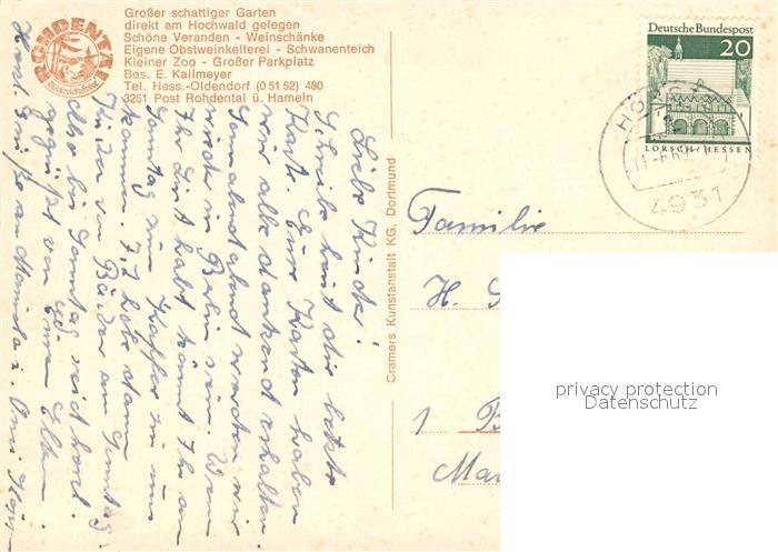 73724446 alte Postkarte Rohdental Hessisch Oldendorf Weinschaenke Rohdental Waldbad Kaffeegarten Hohenstein postalisch gelaufen Erhaltung siehe scans [WerneD78] KatCode: 11110003252007