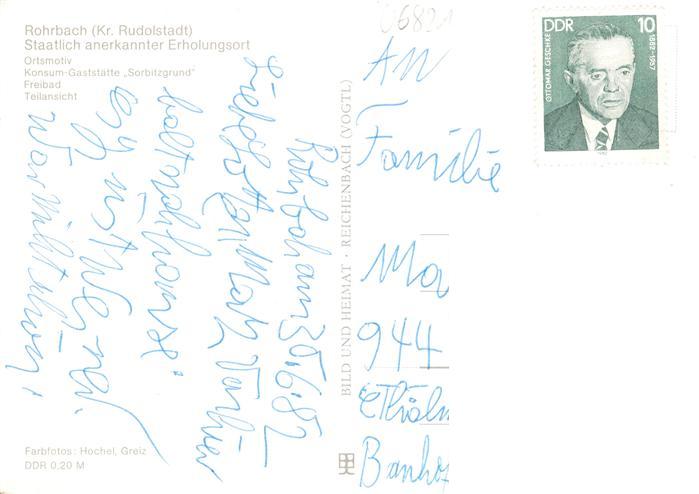 73943477 Rohrbach Rudolstadt Saalfeld Ortsmotiv Konsum Gaststaette Sorbitzgrund Freibad Teilansicht postalisch gelaufen Erhaltung siehe scans [WerneD78] alte Postkarte Wern Katcode 11110016073084